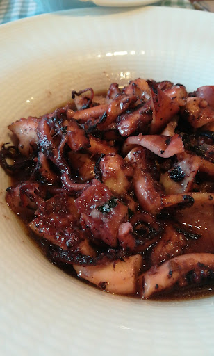 En cuanto a la comida, nos pareció escasa para el precio. Al centro de la mesa sirvieron solo dos platos de jamón (para 9 personas, tocamos a apenas tres trozos por cabeza), dos platos de pulpo roquero con muy pocas patatas, unos caballitos que estaban correctos y tomate con bonito. Al ver que nos quedábamos con hambre, pedimos unas japobravas que aparecían en la pizarra del local, sin destacar especialmente. Como plato principal sirvieron arroz con bogavante, que fue lo mejor de la comida, junto con el postre y el café final.