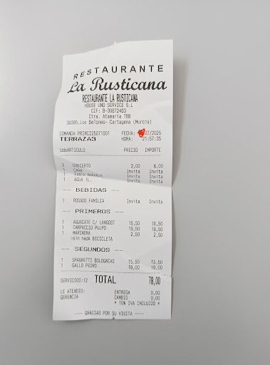 Having owned a house in La Manga now for 6 years, my wife and I thought that we would try Rusticana out with 2 friends. The setting was great and first impressions were good, we were greeted by an attentive and efficient waitress. After that it went progressively downhill. The first course was garlic prawns, completely over cooked. The main course of fish, again the fish was over cooked, with broccoli that was also over cooked. When I asked for replacement broccoli, the second batch was equally over cooked. The waitress explained that it had been cooked 1 hour earlier and would take time to cook a fresh batch!!! So they served me the same again!! Very,...