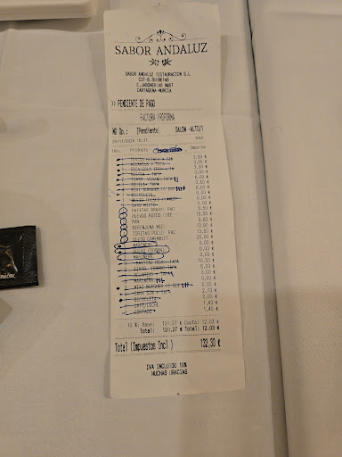 Personas allegadas a mí, están involucradas en las fiestas de Carthagineses y Romanos, la Legión Romana a la que pertenecen, decidió hacer una comida en el restaurante "Sabor Andaluz", sito en la calle Jabonerias N°57 de Cartagena, un menú cerrado, que bajo mi punto de vista era algo caro y con bastantes limitaciones en cuanto a platos y bebida, pero a pesar de todo esto decidí apuntarme a la comida, hasta este punto no tengo nada que reprochar porque la decisión de asistir fue mía. La bochornosa situación comienza en el momento de llegar, mala organizacion a la hora de sentarse, nadie nos decía cuales eran nuestras mesas, descontrol absoluto. Dicen que van a poner platos al centro para cada 4 personas, esto me parece perfecto y es normal, así se hace en la mayoría de restaurantes, nuestra mesa era de 16 comensales, como es lógico deberían poner 4 platos de la comida acordada, pues no sé si las matemáticas no es el fuerte de este restaurante o que hubo algún error logístico, pero pusieron solo 3 platos de jamón para 16 personas, damos las quejas y dio tiempo a ver un capítulo de Juego de Tronos antes de que nos trajeran el plato que faltaba. Con la ensalada ídem de lo mismo, pero esta vez con el agravante de que pusieron solo 2 platos de ensalada para 16 comensales, no me salen las cuentas, damos las quejas y transcurre un tiempo considerable hasta que subsanan esta deficiencia, mientras transcurre todo este desbarajuste pedimos cerveza para pasar este mal trago, alguien también pidió sangría, vienen con una jarra de sangría y otra de cerveza, (os recuerdo que éramos 16) todos sabemos que de una jarra salen 3 o 4 vasos como máximo, sigue sin cuadrarme las cuentas, no pretendo echarle la culpa a nadie, vamos a pensar que la calculadora estaba rota. Pedimos pan y esta vez ponen 4 paneras, pienso "bien, bien, parece que ya han arreglado la calculadora", pero cual es mi sorpresa que la panera que me toca a mí, solo lleva 3 panecillos para 4, alguien se tenía que quedar sin pan, otro suplicio para que trajeran el pan que faltaba, para colmo a la chica que nos trae el panecillo le pedimos por favor que traiga una jarra de cerveza, contestacion: (yo solo traigo el pan, la cerveza teneis que pedirsela al otro camarero) ¿como?, en medio de todo este desaguisado llega el camarero con el siguiente plato que era queso camenbert con mermelada y en un alarde organizativo dice: (Señores, es un plato para 4 personas, cada plato lleva 8Ud, osea que tocáis a 2 trozos de queso por persona), pensé "ostras ahora ya se han puesto las pilas", miro hacia mi derecha y veo 3 platos encima de la mesa y un cuarto plato frente a mí, vale vamos bien, cuento los trozos y Uuups, el plato de mi zona lleva 7 trozos, el camarero acababa de dejar los platos y todavia estaba cerca, educadamente le digo: Perdona, este plato solo lleva 7 porciones de queso", y me contesta: (porque alguno de los otros platos lleva 9), no daba credito a la respuesta y le pregunto (¿me estas diciendo que si me falta un trozo, tengo que mirar en los platos de otros comensales que están bastante retirados, por si les sobra?). Bueno, esto fue una situación dantesca, si sumamos a todo esto el aseo de caballeros con la cisterna del vater rajada por varios sitios y con un agujero considerable, esto denota una dejadez absoluta. Por cierto, creo que fue el encargado el que al final trajo la jarra de cerveza. La calidad de la comida es excelente, pero el servicio deja...