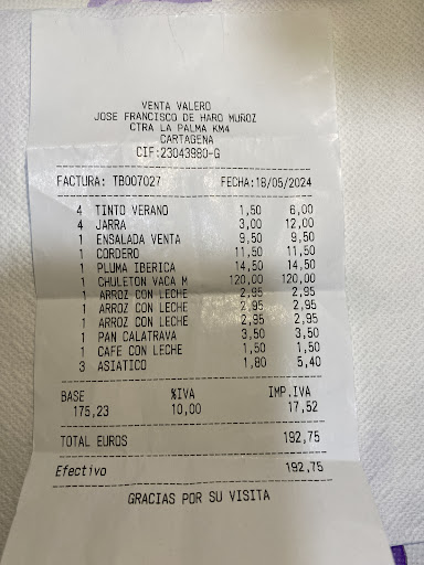 Read moreLa comida bien, sin más. Pero a la hora de pagar tuvimos varios problemas. Pedimos un plato de pulpo a la cartagenera por 5€, como ponía en la carta, el cual me cobraron por 15€. La explicación que me dió el señor de la caja fué que yo me había comido 15€ de pulpo. Tal cual. Pedimos también un plato de pollo al ajillo por 7,50€ y me quería cobrar 15€. Su segunda explicación fué que el pollo al ajillo era mínimo para dos personas, pero en la carta no venía especificado. Le dije que ni si quiera nos lo habíamos comido porque era demasiado y que le pedimos a la camarera un tupper para llevar. Isofactamente fue a la mesa, cogió el tupper y me dijo que me lo descontaría de la cuenta. El hombre super desagradable hablando entre dientes. En definitiva, no...