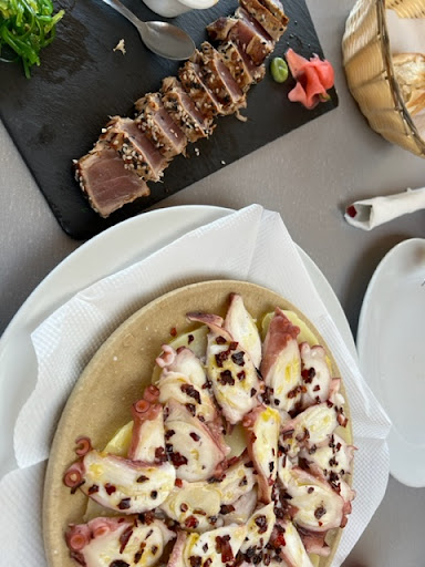 It would be so very simple, such a salvation for many businesses, if they took the time to ask clients "how is the food?", "is everything ok?" etc before the client leaves the establishment. Food - The starters were great, really great. The octopus very tender, a welcome twist with its chilli flakes from the traditional version of Pulpo a la Gallega, and the potatoes just right, soft but not falling apart. The tuna tataki generous, beautifully presented and melt in the mouth. The mains appeared to have been prepared by an entirely different chef. The salmon dry and tasteless. Probably silly of me to expect the advertised capers, onions and garlic to be some type of tapenade, puree, pesto.... I don't know, anything except the almost raw onions, lightly warmed capers and zero garlic that were just chucked on top! The cod, just sad, with its not quite cooked chips and 4 pieces of micro-greens. The atmosphere was loud, like a canteen loud, not funky, chilled, relaxed, friendly. A shame because the decor is great, they have a welcoming no smoking policy in all areas, and of course the view across the bay is lovely. Service - the head waiter/manager (?) was in the middle of explaining the drinks list and literally walked away mid-sentence without a bye or leave to go and chat, along with another waiter, with someone who had just entered the establishment! The (only) waitress literally threw our desert forks on the table, and later, in "drive by" fashion, she threw our bill on the table. Not a word, no asking if all was good, didn't even look or nod in our direction. Just, unmistakably, threw the bill at us!