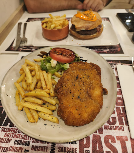 Read moreComida: Tiene comida bastante variada. El precio bueno.... Un poco elevado para al menos lo que pedí. Pedimos 2 rock and roll (perritos calientes) y la verdad que bastante bien, pero el pan un poco meh. Luego también, pedimos cocido montañés y fue un poco.... Raro. Era un mazacote de cocido en un plato el cual tiene decoraciones de pimentón bastante raro distribuido. Para mi pedimos un pollo no pollo porque no como carne y la verdad que muy poco para el precio que tiene, además de que se olvidaron de mis patatas, las que me trajeron mucho después del pedido. Las patatas bastante pobres, aparte de secas y de bolsa Al final nos trajeron 2 cachopos y carrillera con patatas al igual que los cachopos. Las patatas igual, aparte de ser bastante escasas en el plato. El cachopo lleva un pimiento de bote que dentro de lo que cabe, bien. El pan al principio la trajeron uno duro y lo cambiaron luego después de avisar. También por último algunos menús llevan lechuga para decoración pero no lleva ni aceite, lo que las hace incomibles y bastante duras e insípidas.