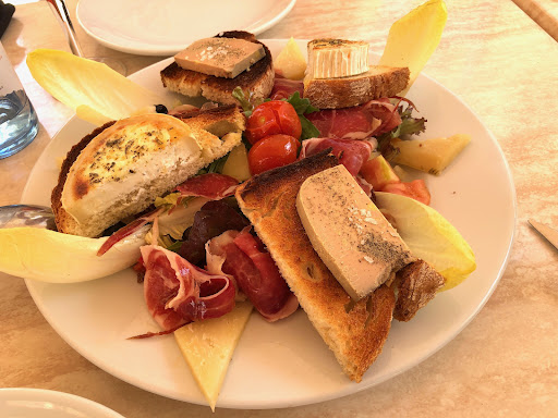 Zum Mittagessen waren wir in diesem hübschen Restaurant und konnten auf der gemütlichen Terrasse sitzen. Nichts Großes sollte es sein, also haben wir den Degustations-Salat bestellt und waren wirklich mehr als zufrieden! Köstlich die Stopfleber, serviert auf frisch geröstetem Brot, wunderbar auch der warme Ziegenkäse, der ebenfalls auf diesem Brot kam, Schinken und Käse allerbester Qualität, darunter eine ordentliche Menge Blattsalate und verschiedene Tomatensorten, superb! Ein feines Olivenöl hat das ganze abgerundet und wir sind begeistert zum Kaffee übergegangen. Dazu der überaus freundliche und aufmerksame Service durch die sympathische Chefin, die sich Zeit für eine kleine Unterhaltung genommen hat und uns mit einer duftenden Aufmerksamkeit auf die weitere Reise verabschiedete.