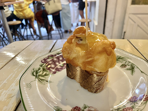 Read moreDecidimos ir a Castellón desde Cullera y escogimos este local para comer por recomendación. Sugiero que hagan reserva. La decoración clásica abstracta, donde hay una mezcla de distintas decoraciones pero que todas juntas tienen una harmonía perfecta. Empezamos con el tartar de salmón ahumado con aguacate y mango que estaba simplemente espectacular, apenas tienen que limpiar mejor el salmón porque me encontré con varias espinas. Acompañando el tartar pedimos unas bravas de boniato que han sido plato estrella, una mezcla de dulce y salado, donde la forma como las preparan, vas a tener ganas de pedirlo nuevamente. Como individuales pedimos el pintxo de txuleton a la piedra y el pintxo de lomo con queso brie. El primero tienes una carne de alta calidad, con sabor, se nota la madurez de la carne, que la terminas de cocinar tú mismo a tu gusto, apenas te la traen sellada en pequeños cortes, luego el segundo una carne super tierna que se te deshace en la boca y un queso brie de alto nivel. Para cerrar pedimos la crema de mango con helado, no soy de dulces pero este me ha ganado muy fácilmente y un tiramisú de chocolate blanco a la italiana, con una presentación muy interesante, una textura muy cremosa y agradable. En todo lo que pedimos se nota la calidad de los productos utilizados para elaborar cada plato. El concepto es alta cocina presentada de forma minimalista a través de pintxos. No se confundan, no son los pintxos que les sirven en el bar del barrio con una cerveza. Para terminar el café está simplemente buenísimo !! Entre todo les recomiendo este local y seguro que la próxima visita a Castellón...