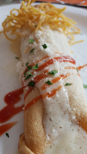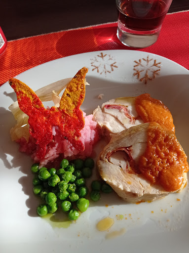 En cuanto a la comida... Brutal!! Menú de 14€ super completo. Pedí carpaccio de ternera con queso parmesano y estaba muy rico (un poco frío para mi gusto, pero muy rico) y de segundo cogí pollo relleno con jamón, queso y sobrasada, se deshacía en la boca. (Adjunto foto)