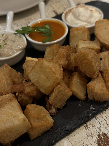 En cuanto a la comida nos sorprendió la gran variedad con la que cuenta la carta y como los sabores y texturas se adaptan a todos los paladares. Mi plato preferido fue el entrante de Yuca con salsas que nada tiene que envidiar a muchas patatas bravas que he probado en otros establecimientos. También cuenta con opciones orientales como mi principal que fue el Pan Bao con proteina de guisante y salsa teriyaki o las gyozas sendas...