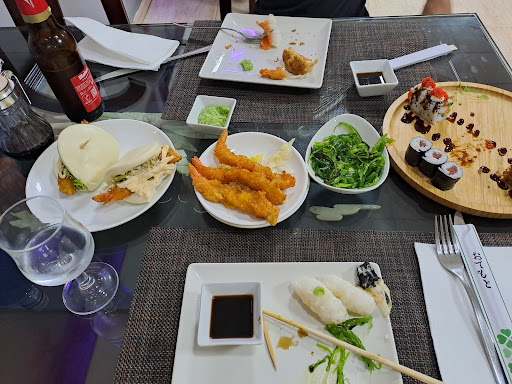 Empezemos... porque da para largo esto. Primero, las bebidas las sacaron una vez sacaron ya 3 platos, sin palillos en mesa, la camarera no sabia atender ni escribir losnplatos por lo que tuvo que venir la compañera y volver a coger toda la comanda, el wakame con sabor raro, creo que pasado, las giozas con aceite reutilizado y negro los baos con algo de lechuga, una gamba enmedio y medio bote de mayonesa , ademas de nada esponjosos y duros, los makis y nigiris , al igual que todo el sushi, pasado o hecho con mucha antelación... el wasabi no picaba, y las algas que rodean el sushi muy duras. Quise dar una 3a oportunidad a este local, porque en 2 ocasiones anteriores que pedi a domicilio dejo mucho que desear, tales como el sashimi congelado o tallarines fritos, literalmente telos podias poner como casco de moto. A pesar de la cercania de nuestra casa, no volveremos. Pd. Ahora entiendo los precios tan bajos y que no se cobre suplemento si te dejas algo en el plato. Lo siento pero no volveremos. Si alguien quieres probar buen sushi de buffet, como experta, os recomiendo mao fu o kioka de...