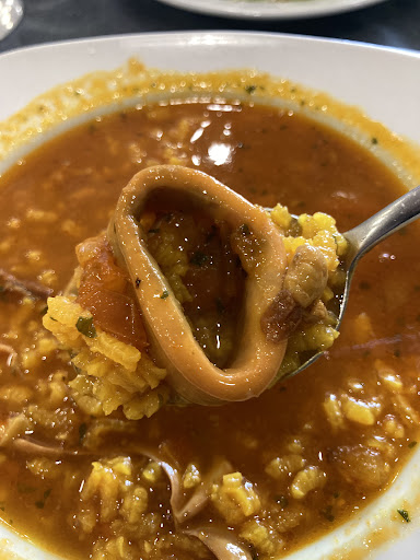 Read moreDe primer plato sopa de marisco con fideos, los fideos estan tan hechos que estan gelatinosos, los productos del mar pasados y la sopa pasada de sal con calamares de color marron . Supongo que es fruto de estar calentando continuadamente la comida, porque el servicio fue instantáneo. De segundo jamon de cerdo a la brasa con patatas, el sabor fue bueno porque tienen el gusto propio de las brasas, pero la carne estaba seca , las patatas "bien" y el postre bastante deficiente. No entiendo como teniendo un brasador hacen tan pesimo trato a la comida. Pero el exceso de aceite de la sopa denotaba que no eran buenos/as cocineros/as.