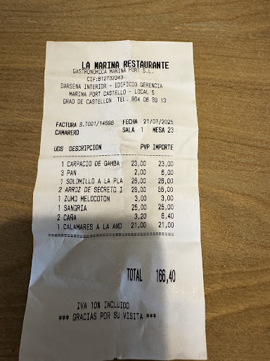Me he tomado la molestia de escribir estas líneas ya que , NUNCA , y repito NUNCA, había recibido una atención tan mala y el producto era tan decepcionante en relación calidad-precio como en La Marina del Grao de Castellón. Y el abanico de establecimientos frecuentados es variado , os lo puedo asegurar. Desde bares de carretera ( todos mis respetos hacia ellos), franquicias, locales de precio medio, street food, a reputados restaurantes tanto en España como en el extranjero ( Roma, Milán, Verona, Nueva York, San Francisco, Londres, Shanghái, Praga, Varsovia...aunque como en España ningún sitio.