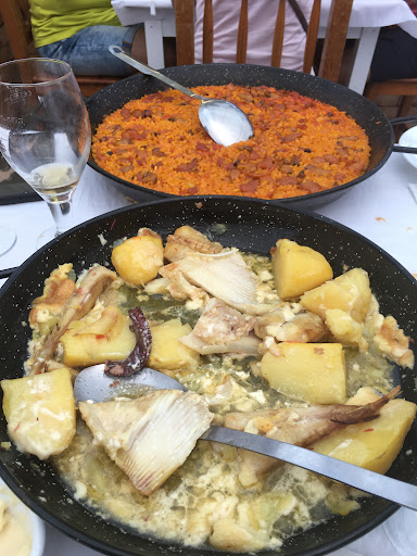 La hora y pico hasta que llegó la comida fue un espectáculo, tuvimos que ir al coche a por unos cartones para abanicarnos porque el calor era insoportable, lo curioso es que llegó gente a las 15 horas a otras mesas y nada más sentarse, a los 10 minutos tenían ya comida y bebida, de hecho, una de las raciones no sabíamos cómo sería y se la vimos a los últimos que se sentaron antes que a nosotros, de traca, pensábamos que todo habría sido un atasco de cocina..., pues no,,, llegó todo junto, los primeros platos que habíamos pedido junto con el arroz, todo juntito, no se veía la mesa...
