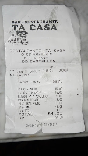 El precio de 14€ por un menú que incluye bebida, pan, postre o café es insuperable, considerando la calidad de los platos y el excelente servicio. Sin duda, Ta Casa Castellón es un lugar al que volveremos muy pronto. ¡Altamente...