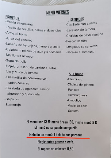 Read moreComidas para grupos muy numerosos, por lo menos encontramos algo de sabor dentro de la dificultad que es cocinar para tanta gente, aunque con frecuencia las personas "mayores" se guían antes por la cantidad que por la calidad. Había un dúo tocando música ""en directo"* los temas estaban bien elegidos para el baile, los dedos del teclista se movían al compás de la música interpretando un playback fácilmente "adivinable" para cualquiera mínimamente puesto en la materia, seguramente este señor que cantaba no tuviera ni idea de hacer una escala de do al teclado, una injerencia en materia musical que no debería de estar permitida puesto que es engañar al público, hacer como que tocas, pero no tocas. En general el resultado total fue un aprobado general del grupo al local sin ninguna...