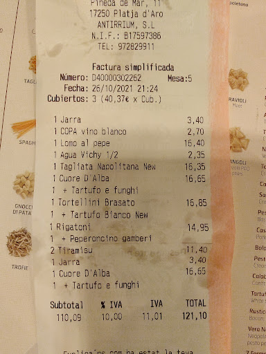 Esta reseña llega un poco tarde pero MEJOR TARDE K NUNCA JAJJA!!!! Primera vez que pisaba un tagliatella y de casualidad se hizo estando en PLATJA D’ARO ya que estuvimos de vacaciones por la costa brava … Teníamos hambre ya que durante el dia no habianos comido mucho y pensamos en comer pasta ya que nos podia llenar, pero lo que desconociamos de este restaurante es que que las raciones son bien generosas, PARA AQUELLAS PERSONAS QUE A VECES SE QUEJA DE QUE LAS RACIONES NO SON GENEROSAS EN ALGUNOS RESTAURANTES AQUI NO CREO QUE HAYA MOTIVO DE QUEJA ALGUNA…. Lleganos al establecimiento y desde que nos vieron llegar la atencion fue agradable y se preocuparon por buscarnos un sitio… yo me percate que una mesa estaba compartiendo unos macarrones Bolognese y pense.. joer vaya platito, lo que si no pense es k luego nos tocaria a nosotros!!! Bueno una vez ya sentados la atencion fue agradable y pensamos en pedir un plato cada uno ya que mi pareja es vegetariana( aqui no hay problema xk hay opcion para todos los gustos) una focaccia para compartir que vimos pasar y nos apetecía mientras esperamos nuestros platos principales y sobretodo ya que estabamos alli y vimos con buen ojo por estar a muy buen precio fue un par de APEROL SPRITZ!!! muy bien hechos!!! Las raciones como ya mencione bastante generosas y quizas el rissoto muy saladito y lo unico que si voy a penalizarlos con una estrella es que el plato de mi chica como mencione ella era vegetariana y se pidio una pasta con quesos pues le toco un trocito de carne molida que se lo comentamos a la camarera y nos pidio disculpas…. No lo devolvimos por dos razones primero porque mi pareja es bastante tranquila con eso y no nos gusta tirar comida y segundo que yo trabajo en gastronomia y soy tolerante con esos errores pero hay k entender k muchos clientes no son iguales con ese tema…. Asi que tener mas cuidado la proxima vez. Pese a este pequeño fallo volveria a repetir y a recomendar xk en general la calidad precio me parece correcta...