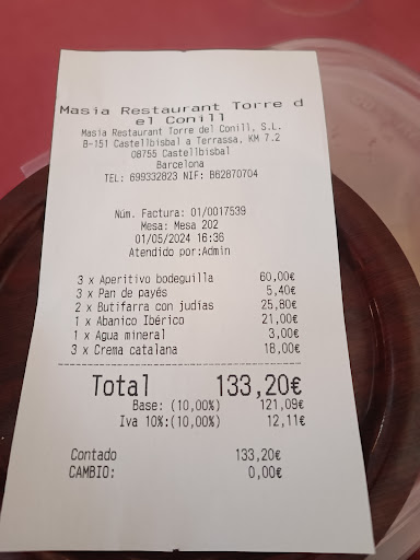 Read moreExperiencia agridulce. El lugar es precioso, la masía pintoresca y la terraza está muy bien para cenar a la fresca y para que los nenes jueguen pero...fuimos a cenar el sábado porque habíamos reservado la terraza, y al llegar nos encontramos con un baitizo de mediodía que aún seguía a todo volumen en la terraza y la imposibilidad de cenar fuera. Nos tenían que haber avisado como se hace porque elegimos el sitio en gran parte por el entorno y en otro restaurante ya nos avisaron que había eventos. Nos ofrecieron cenar dentro y siendo la hora que era aceptamos, el aire acondicionado a tope y un poco descolocados porque la música estaba altísima como si el resto de comensales que estaba allí no importara. Tras el bautizo siguió una boda y más de los mismo. La atenció del personal, excepto algunas camareras, dejando que desear, ni una disculpa o un detalle en cuenta por el malentendido. Al llegar la cuenta nos sorprendimos de lo que había subido, una barbaridad para un plato único cada uno, una bebida y no todos comiendo postre ... Éramos 4 adultos y dos nenes pequeños...Nos habían cobrado extras entre el pan que te ponen y demás que lo pagaría por un menú caro. Podrían preguntar si quieres esos extras antes de tomar nota. La comida bien, la verdad es que los platos buenos... Pero entre que no pudimos disfrutar de la terraza y con la Música a todo volumen, el trato poco atento y el palo que nos dieron en la cuenta... No creo...