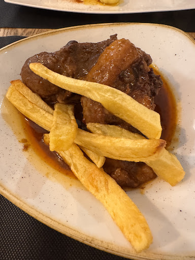 Optamos por algunos de los platillos más destacados del menú: rabo de toro y pulpo a las brasas, acompañados de un buen vino Albariño. De entrantes, pedimos las anchoas asturianas y las croquetas de queso Camembert, ambas opciones deliciosas. El rabo de toro fue, sin duda, el plato estrella: se deshacía en la boca, con un sabor delicado e intenso y una textura perfecta. El pulpo, tierno y con ese toque de brasa que le aporta un gusto inmejorable y un picor justo.Para cerrar, compartimos la tarta de queso, cremosa y con el punto justo de dulzura.