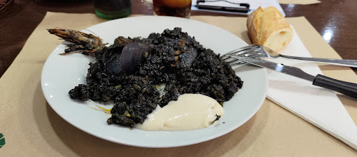 Cabe destacar la rapidez del servicio porque cuando pides tardan 2 minutos y tienes el plato en la mesa, si quieres comer rápido es el sitio ideal, también los camareros que nada más te ven ya te están preguntando por bebidas y te traen la carta. Me gusta el sitio por qué aunque no sea muy grande la gente es muy cívica y una vez come sale del local y deja el turno al siguiente,por lo que cuando entras casi siempre tienes una mesa. Ahora hablemos de comida 😃. Me he pedido de primero un arroz negro con alioli y el primer bocado me ha encantado, enseguida le he dado de probar a la pareja por qué sabía que le iba a gustar, pero casi cuando estaba terminando el plato me iba dando cuenta que estaba demasiado salado😅 y me costaba terminar el plato. Como soy de comer poca sal estoy seguro que a otros seguro que les encantará. De segundo me han traído a la mesa un entrecot en salsa de roquefort con patatas poco hecho🐮, que salga corriendo según lo cortas y me ha gustado mucho. (Aunque en la foto que subo es la de mi amigo, a mi plato no le he hecho foto. El suyo es muy hecho...