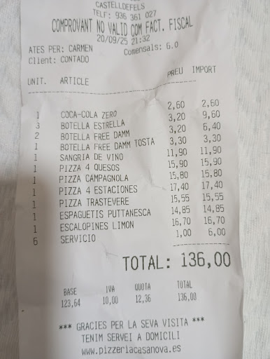 La cuenta subió a 256,55 euros, lo que hace unos 23,32 euros por persona. No me parecería un precio excesivo si la comida hubiera estado buena, si la maître no hubiese sido tan desagradable y si no hubieran añadido un cargo llamado ''Servicio''. Dicho concepto, se resume en que te añaden un euro por persona a pagar en la cuenta, por ponerte, lo que según ellos era una cortesía del restaurante. Sí, efectivamente, las cestas de pan, el aceite picante y los cacitos de parmesano.