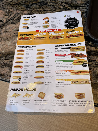 Read moreEigentlich wirkt der Laden (Restaurant, nicht der nahe gelegene aber zugehörige Fastfood Schuppen) etwas abgehoben, Touri-Abzocke drängt sich schon fast auf. Daher prüfe wer sich niederlässt. Zum Glück aber stellte sich das Rober's als durchaus angenehme Location heraus. Noch konnte man (Oktober) im freien sitzen. Aus den unauffällig angebrachten Lautsprechern plätscherten die Hits der 80er. Als kleine Aufmerksamkeit gab es vorab eine kleine Schale Muscheln. Bier - hier ist Amstel im Ausschank, ein guter Grund auf ein lokales Produkt auszuweichen. Ein 2012er Chrianza LAN durfte es sein. Bei etwa 8 EUR Online sind 13 EUR durchaus ein angemessener Preis. Leider (wie so oft) schlecht, weil zu niedrig temperiert. Ernährungstechnisch gab es Pa amb tomàquet, eine grobpoorige Weißbrotsorte. Geröstet, dazu Knobi und Tomaten zum darauf verreiben. Salz und Olivenöl dazu. Einfach aber Lecker. Vier Scheiben für 1,50 - passt! Vorspeise durfte für mich Chorizo de León Picante sein - Hauptgang Presa ibérica al carbón, gegrilltes Iberico-Schwein. Und ja, Sünde - als Nachtisch noch die Crema catalana y carquiñoli. Dazu ein Cortado. In Summe schmeckte alles sehr gut, Preis und Qualität stimmten. Sauberkeit - zumindest im Sanitärbereich war aus meiner Sicht alles OK, die Tische sowieso. Leicht chillig, dezente Musik, ein Billardtisch, Bar bläulich illuminiert. Durchaus ein Platz an dem man sich wohl fühlen kann. Einiger Kritikpunkt - das Personal sprach wirklich nur Spanisch (und/oder Katalanisch). Gut das es hier freies WLAN und zu Not den Google...