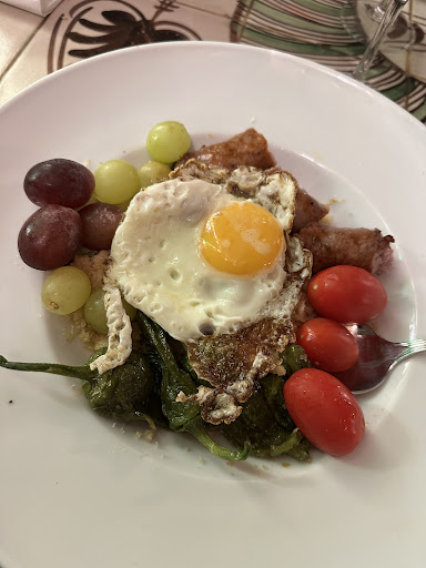 Para empezar, las migas fueron un auténtico deleite. Presentadas con un huevo frito perfectamente cocinado y acompañadas de ingredientes frescos como uvas, pimientos y tomates cherry, cada bocado ofrecía un contraste de sabores y texturas que resaltaban la esencia de la cocina aragonesa.