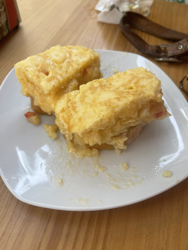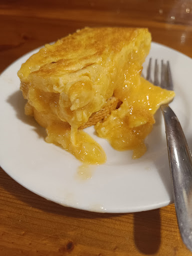 La tortilla es cremosa, poco cuajada y con un sabor especial, un obligatorio si visitas esta casa. Llegamos y le faltaba 5 minutos para salir, curiosamente la elaboran en una lonja cercana de 13:00 a 15:00 y de 19:30 a 22:30. Según aparece en el bar ves el éxito de ésta porque no paran de servir pinchos. Cortada en rectangulos y servida al momento.