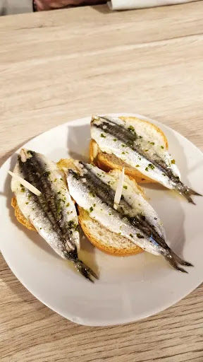 Las anchoas en vinagre o boquerones son otro de sus clasicos y obligatorios. Tersas, con su punto de acidez justo y perfectas. Es una gozada verlas en la enorme cazuela de barro que tienen en la barra, brillantes con su aceite de oliva, ajo y perejil picado.