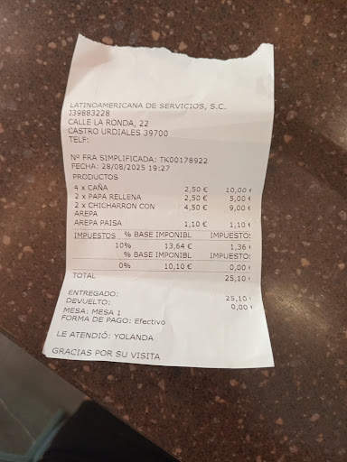 Read moreHemos venido varias veces a este restaurante, pero nuestra última visita fue muy decepcionante. Pedimos una ración de chicharrón y nos cobraron el doble, además de otra arepa que no habíamos pedido. Cuando pedimos explicaciones, la persona que nos atendió confirmó que ella habían añadido esos cargos, pero nunca nos lo aclararó antes de servir la comida. Es totalmente inaceptable que te cobren de más sin avisar, y la situación resultó bochornosa. Por esta experiencia, no volveremos y no lo...