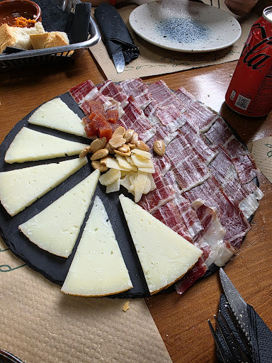Los primeros platos del menú tardaron alrededor de 40 minutos, y era magro con tortilla pero no tenían tortilla por lo que solo pedi magro con alguno huevo o similar, me hicieron caso omiso y solo me pusieron magro. Entre medias se le pidió pan 2 veces a distintos camareros. La primera camarera la cual le faltaba experiencia en el sector de la hostelería por lo que pude apreciar nos ignoró al solicitar pan. Al no traerlo se lo pedimos a otro camarero y nos mencionó que no había pan porque su pan era congelado.