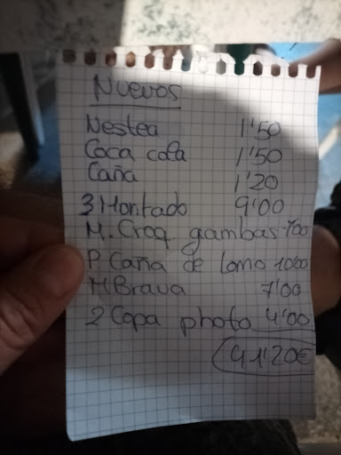 Comida: en una palabra, una vergüenza. Unas patatas fritas estilo a las de paquete caseras empapadas de un aceite sucio que además olía mal, evidentemente no nos la comimos. Unas croquetas saladas y de dudosa elaboración casera por las que nos cobraron 7€ (6/7 unidades) Unos montaditos de melva con el pan sacados del congelador. Una caldereta de venao avinagrada y no se le ocurre otra cosa a la cocinera que decirnos que se hace con vino, esto si se lo dice a una que viene e de Despeñaperros para arriba lo mismo se la cuela pero a gente que sabe de lo que habla pues... No me quieras hacer subnormal. Como es lógico y ante el miedo a que nos sentara mal, no lo comimos.