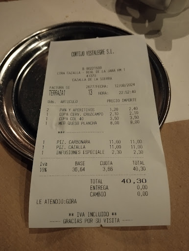 Read moreLlegamos a Cazalla con la intención de cenar en otro lado, porque creíamos que no abrían por la noche del miércoles, pero al pasar por el frente vimos que estaba abierto y nos decidimos a entrar. No es la primera vez que comemos ahí, pero esta vez íbamos con la firme decisión de cenar pizza. Así que entramos y nos dieron una linda mesa en la terraza. El camarero nos atendió muy amablemente desde un principio y nos ofreció el menú fuera de carta. Nos decidimos por empezar con un par de pimientos del Padrón rellenos de cordero y un par de empanadilla de perdiz. Ambos buenísimos. Después competimos una pizza de carrillera. Absolutamente deliciosa! Para cerrar con unos capellinis a la crema que estuvieron también muy ricos. Por último nos deleitamos con un arrocito con leche de lo más casero. En resumen… pasamos una velada súper agradable, cenamos delicioso, el servicio de lo mejor. Absolutamente recomendable!!