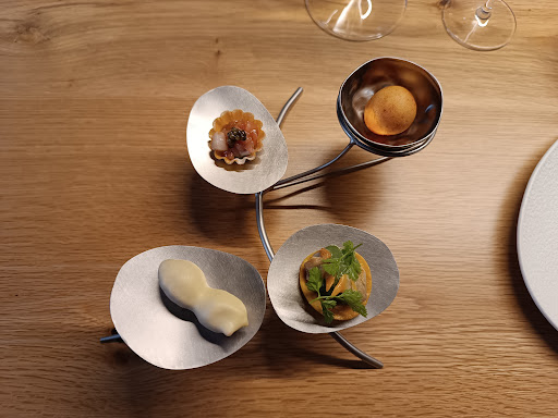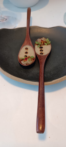 Pel que fa la cuina, és on penso que hi manca certa definició i/o ordre. Dit això, la creativitat, fragilitat, les tècniques, l’emplatat... és excel·lent. O a mi m’ho sembla. Res a dir. A mes, tan sols veient la petita cuina que tenen, ja denota que el que fan té moltíssim mèrit. Molt. Tanmateix, es denota que el xef té un munt de coneixements i virtuts, i és com si tingués pressa per mostrar-los tots de cop, i és quan penso que s’acaba perdent l’horitzó o s’acaben fent coses que no lliguen. Per posar un exemple, una excel·lent carn de vedella (steak tartar) combinat amb una excel·lent anxova del cantàbric: de dos productes excel·lents s’acaben eclipsant i acabes no valorant-los el que els valoraries per separat. Tampoc acaba de quadrar els girs en el menú o capítols: ara marisc/peix, ara carn, ara tornem al marisc... Com dic, fa la sensació que hi ha ansietat per demostrar el que saben i fan, però manca una mica d’ordre o sentit. Quan s’hi posi, simplement serà excel·lent. És a dir, hi ha talent, i no hi ha d’haver pressa perquè amb el talent, que el tenen, els èxits arriben.
