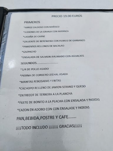 Read moreHemos pedido el menú, una gran variedad de primeros y segundos que se pueden ver en las fotos. La lasaña casera, estaba muy buena pero un poco reseca, imagino que llevaba tiempo salida del horno y la han recalentado, pero muy sabrosa y rica Los judiones, una cantidad, qué perfectamente pueden comer dos personas. Muy ricas y suaves. La pierna de cordero, la carne un poquito seca, pero en general bien. El cachopo, super bien hecho, he echado un poco en falta más sabor del jamón y el queso, pero otro día repetiría. Las patatas caseras y muy ricas!. La tarta de dulce de leche, muy rica..me ha chocado un poco el borde y su esponjosidad, pero de sabor estupendo! La sandía muy rica y nos han invitado a los chupitos. Los camareros muy amables y...
