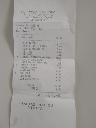 Read moreOnly Mexican restaurant in Ceuta. Kind of far away from center. Very nice waitress. Beautiful indoor decor and aesthetic. I am from Texas, and this Tex Mex food didn’t taste very authentic. It could have tasted better and had bigger portion. They had a nice sized menu. The prices are rather pricey. I spent €11.20 on enchiladas and a water. I would come back, but that’s just because I’m desperate for...