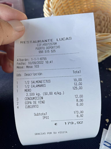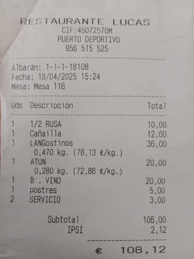 Read morePagas por lo que pides, y la calidad es incuestionable. Comida muy satisfactoria: entrantes de cortesía de la casa (aceitunas aliñadas y tomate aderezado); ensaladilla rusa de marisco (media); ración de cañaílla; casi medio kilo de langostino tigre (¡extraordinaria frescura y elaboración!); ración de atún de almadraba (casi 300 gramos de exquisitez a la plancha); una buena botella de blanco Ribera del Duero burgalesa; un postre y licor cortesía de la casa. Servicio profesional, y buen asesor de vino. En el ticket te indican el peso de lo que has pedido, y por lo...