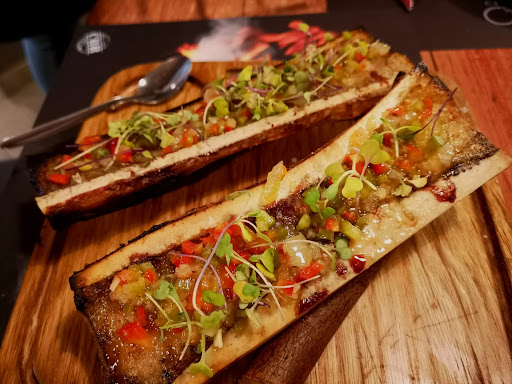 La oferta culinaria de Conrado Brasas Bar es simplemente fascinante. No puedo dejar de mencionar el tuétano a la brasa con pipirrana, una auténtica delicia para los sentidos, o la sartén de boletus, huevos, morcilla de Burgos y cebolla caramelizada, una combinación de sabores que te transporta al paraíso gastronómico. Y no puedo olvidar mencionar el pan tostado con diversos aliolis, especialmente el de miel, que es simplemente espectacular. Además, su carta de hamburguesas especiales es una experiencia que no puedes perderte.