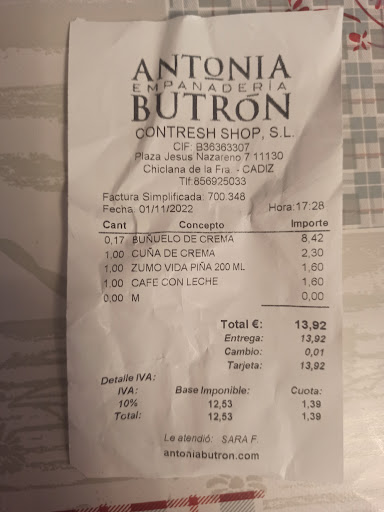 Read moreMy favourite in Chiclana. They bake their bread and sweets. Variety of breads. Love the seeds bread. Very large natural orange juice glass. The hot chocolate they make it too sweet for my taste. Beautifully decorated. Great, fast service includes beeper for when the order is ready. Love it! Tasty dates pies, you can tell the lady to warm...