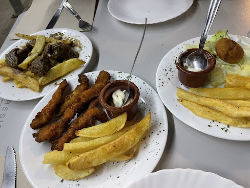 Read moreHemos estado comiendo, domingo de agosto a las 14:00, aparte de la carta, tienen algunas sugerencias en pizarra, nos decidimos por el flamenquín (bastante bueno) y las croquetas de puchero ( un poco saladas pero son caseras, así que bien) no les queda carne para la parrillada que parece ser la oferta de la casa. El servicio al principio no parece muy agradable pero a medida que hablas con ellos, son gente amable, no hay aire acondicionado, en el interior hay ventiladores de techo, aun así hace bastante calor, pero mejor que en la terraza se está. Comiendo una cantidad normal sales a unos 18/20€ por persona. El flamenquín es enorme así que lo compartimos y las croquetas pedimos media ración por que son generosas. La ensalada de la casa….normal. Para acabar de aterrizar en Chiclana y salvar la...