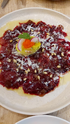 Situado en el centro, a espaldas del centro de interpretación del vino y la sal, que también es oficina de turismo. Local amplio, luminoso, no muy recargado de decoración cuenta, además, con mesas en la calle, que es semi peatonal. La carta no es muy extensa, pero cuenta con un poco de todo; tapas, para compartir, un par de arroces, carnes y pescado. Teníamos reserva y al llegar nos encontramos con la mesa montada y en el centro la carta y una tablilla con un “simple” folio para los fuera de carta CON SU PRECIO (lo que cuesta que todos los locales hagan esto). La atención por parte del personal de sala es muy cercana. La persona que nos tomo la comanda, nos sugirió un par de platos y se encargo de dar el orden de salida de los platos, que llegaron a un muy buen ritmo. Toda la comida estuvo espectacular, a destacar el carpaccio de paladar de atún, el crujiente de atún ahumado y el gazpacho de mango (aunque tenia más textura de salmorejo). Muy rica la tarta de queso, sin base de galleta, a la que le faltaba algo más de sabor a queso. Sitio muy recomendable para un...