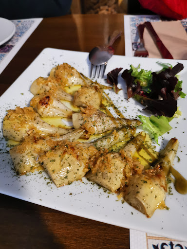 Pedimos de entrantes unas alcachofas que estaban muy buenas, nunca había comido alcachofas y decidí probarlas y fuen un gran acierto junto a la pata de pulpo a la brasa en una cama de patatas fritas que la pata estaba en su punto y las patatas super crujientes (cierto que tenían un poco de aceite pero eso para mí no era un problema)