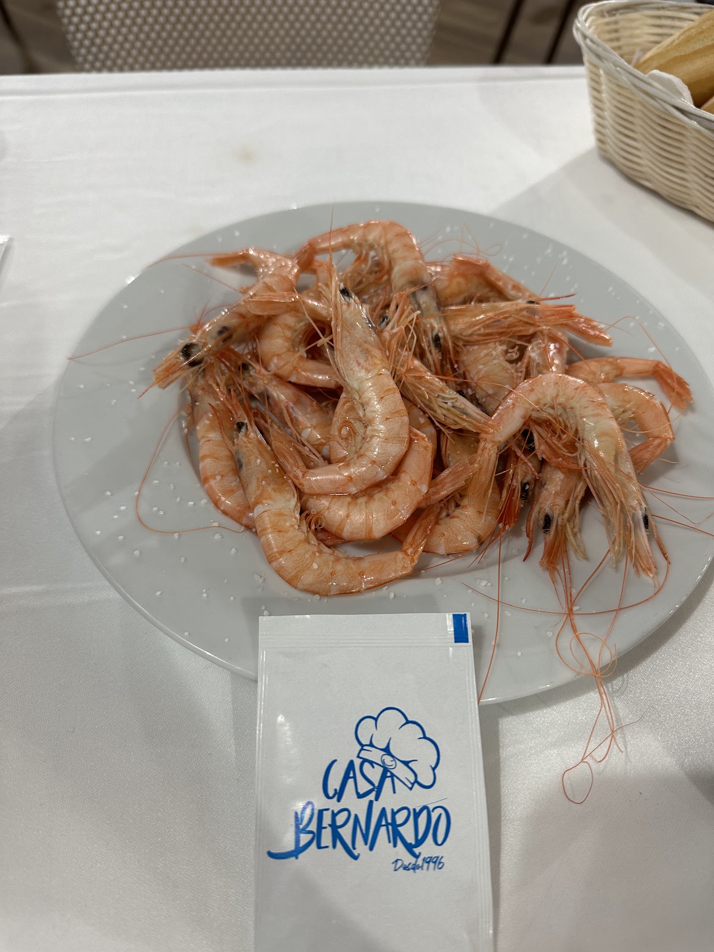 De casi todos los platos hay raciones y medias raciones y de algunos, incluso tapas, lo cual te permite probar más variedad. Nosotros nos pedimos (entre tapas, medias y raciones) unos mejillones con pipirrana, huevas aliñadas, pulpo aliñado, langostinos chiclaneros, cañaillas, acedías fritas y ortiguillas fritas.