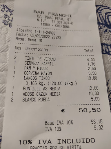 Considero al FRANCHI uno de los mejores sitios para tapear de Chipiona. Hemos ido los últimos tres años más de una docena de veces y siempre hemos recibido un excelente trato. Esta vez no puedo decir lo mismo. Esta reseña es para los clientes foráneos y así sabrán por mi mala experiencia a qué atenerse. Yo esto ya lo he hablado con el propio Franchi y conoce mi opinión. El pasado miércoles 16, día del Carmen, decidimos celebrar en familia una cena en el restaurante FRANCHI de Chipiona. Éramos cuatro: mis dos hijos, mi mujer y yo. La noche prometía ser especial, y vaya si lo fue. Comenzamos pidiendo unas tapas: choco, almejas y pulpo. Todo iba bien hasta que decidimos probar la famosa Urta. Pedimos una tapa, pero el camarero, gran profesional, decidió no ofrecernos la carta ni advertirnos que la Urta se vende entera. Así que, sin saberlo, nos encontramos con un pez de 2,06 kilos a 70€ el kilo. ¡Sorpresa! La Urta, aunque deliciosa, nos dejó un agujero en el bolsillo que ni el mejor pulpo a la gallega podría llenar. Pero, ¿quién necesita advertencias sobre precios cuando puedes tener una experiencia gastronómica tan "auténtica"? En resumen, si buscas una cena llena de sorpresas y no te importa pagar el precio de un coche de segunda mano por un pez, FRANCHI es tu lugar....