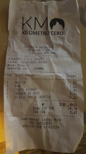 Read moreComer en Kilómetro Cero ha sido una experiencia fantástica. Cada plato sorprendió por su sabor y la calidad de los ingredientes. El entrecot argentino estaba en su punto, jugoso y con un sabor increíble; los champiñones a la brasa, sencillos pero preparados de forma que resultaban irresistibles; y los canelones de costilla con salsa de queso fueron, sin duda, uno de los grandes aciertos de la comida. También probamos propuestas más originales, como el salmorejo con remolacha, pepinillo y atún en el fondo, una combinación que nos encantó, y la cazuela de bacalao, sabrosa y bien equilibrada.