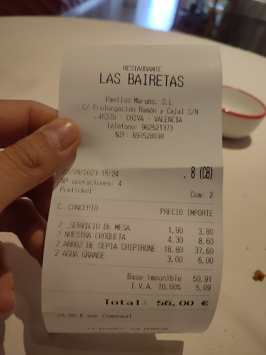 Read moreDespite its relatively remote location (in the outskirts of the city, you would most likely need to take a car there, plenty of parking spots around though), Las Bairetas is one of the best traditional Valencian rice restaurants in the region. The locale is modern and the staff is very attentive, there is a nice variety of entrées that all have an alluring appearance and sense of sophistication. Beware though, do not overfill on these dishes as the star is the rice dishes that they cook (on demand to be done BEFORE the visit) over open flames that are managed by expert paelleros. Been here several times and it has never disappointed, fully recommend, particularly if you want to try actual paellas and rice dishes and not touristy garbage that can be found in many...