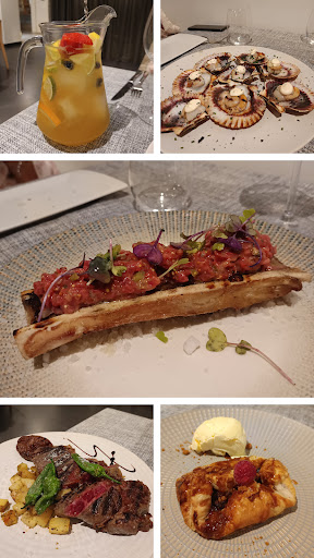 Vaya por delante que a nivel general, nos gustó la cena que tuvimos, pero hay algunos aspectos claramente a mejorar que hacen que de momento no pueda ponerles las 5 ⭐. El producto me pareció muy bueno, tanto las zamburiñas, como el steak-tartar con el tuétano, el entrecot (punto perfecto y buen tamaño) y el Strudel de postre (muy rico, aunque algo pequeño).