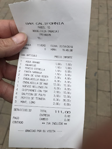 Señor@s gerentes del Bar California: pongan una carta, indicación o lista de precios para que no pensemos que son unos ladrones. P.D.: No abusen del...