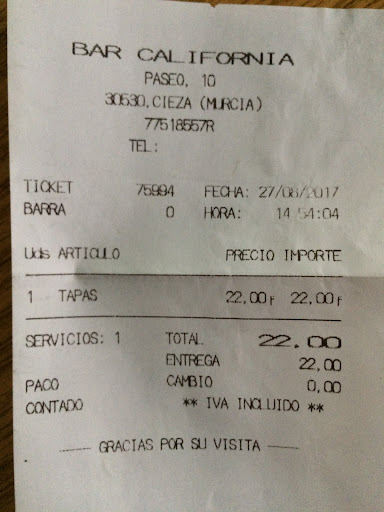 It was 1993-94, my first time to travel in Spain. My friend and I caught the train from Almeria to Barcelona where there was a connection change at Murcia, with a multi hour waiting time for our train. This is when we found Bar California. And what a fabulous find. Not speaking Spanish was not a problem. The bar tender introduced us to the many wonderful tapas available, which we throughly enjoyed. Then to top it off, two of the customers took us for a tour of their beautiful Cathedral. One was the local artist, the other the local policeman. I am so happy to know that this bar is still open, and the reviews are...