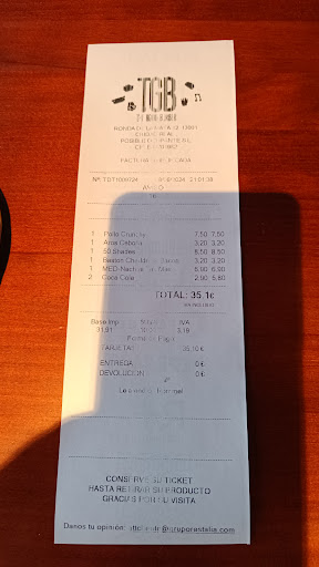 Fui a comer un día y la hamburguesa casi cruda, es decir bastante roja.. Voy a otro día a cenar y pedimos 8 hamburguesas, todas con extra de carne y algunas sin salsa y mahonesa. A la hora de recoger, vienen todas en una bandeja y le digo que cuáles son las órdenes especiales y me dice que no he pedido órdenes especiales, a lo cual le enseñó que hemos pedido varias sin salsa y alguna sin queso y mahonesa. Se ríe y me dice que eso no lo hacen, que miremos una a una para saberlo. (Muy mal por tener que tocar todas las hamburguesas para saberlo.) Una vez revisadas vemos que una de ellas no tiene extra de carne, a lo que voy con la hamburguesa y el ticket a decírselo y el chico de malas maneras me coge el ticket y me dice es imposible porque se ha revisado todo, dándome a entender que se le ha sacado la carne. Me dice que le vuelva a traer todo el pedido para revisarlo. Y le digo que me está faltando el respeto porque ni yo ni nadie hemos sacado una carne, es más.. tendría queso pegado en la otra carne.. Se vuelve a reír en mi cara y me alza la voz.. tanto él como sus compañeros. De malas maneras accede a hacer otra hamburguesa y al rato la lleva a la mesa y tira la bandeja diciendo en tono borde: "Toma la hamburguesa". Acto seguido me levanto a pedir la hoja de reclamaciones y me dice que no tiene.. Le digo que por ley debe tenerla, y me dice que no, que no tiene. Le digo que o me la da o llamo a la Policía. Al verle las orejas al lobo se viene hacía la mesa y de buenas maneras empieza a lamentarse y pedir perdón por lo ocurrido. Un desastre los empleados de Ciudad Real con la buena reputación que tiene la marca TGB del...