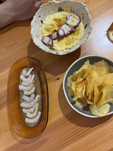 Primero, empezamos con los entrantes. El camarero nos explicó una a una las propuestas de entrantes y cada elaboración. No os podéis perder las gambitas ahumadas, una explosión de sabores. También pedimos las chips de patatas y la ensaladilla rusa; esta última es de las más diferentes y ricas que hemos probado, un deleite para el paladar.
