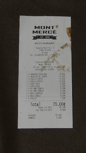 Read moreExcelente servicio recibido en el Restaurante Mont-Mercè. El camarero fue bastante amable con nosotros y nos trajeron la comida sin esperar demasiado. A la hora de pedir mesa, pudimos reservar con antelación y, una vez salimos de la playa, nos permitieron una y al instante nos la dieron, sin esperar demasiado.