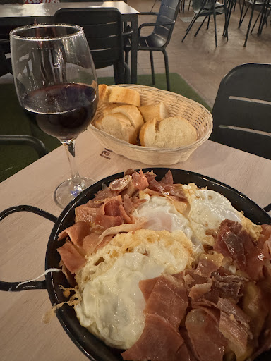Read moreUn sitio tradicional y estupenda elección para desayunar por ejemplo, como fue mi caso, o para comer comida de la de siempre y bien hecha, tanto fuera como en el comedor interior que también tiene y seguro que no es pequeño, aunque lo que es pequeño sí es verdad es la zona de barra,pero lo dicho, acogedor interior también. Yo me tome unas buena barritas con tomate y aceite por 3 euros en su terraza interior-exterior, viendo las fotos o cuando se llegue al lugar, un poco escondido pero señalizado, entenderéis lo de la terraza. Disfrutando de su tranquilidad, al menos por la mañana, que seguramente cuando sea la hora del vermut o de comida seguro que hay mas jolgorio, y con un servicio amable y ágil, más que una buena opción para empezar bien el día o...