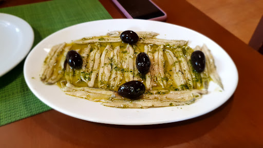 En nuestro caso, pedimos unos Boquerones en vinagre (13 €) que se aprecia que, claramente, son caseros por el corte y la forma en la que se han limpiado los boquerones. Además, los sirven con patatas para que puedas montar los boquerones sobre las patatas y, por supuesto, os recomiendo pedir pan para mojar en el plato.
